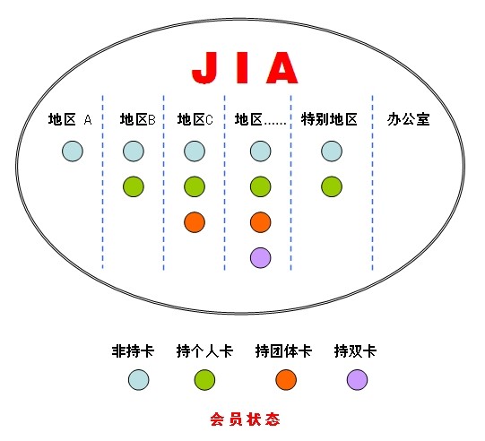 为了方便管理,会员归属到不同的JIA工作营地区。目前JIA的地区有:广州、湛江、南宁、桂林、吉首、长沙、宜昌、海口和广州后援组共9个地区。