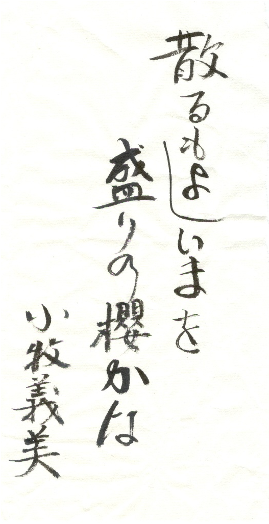 “凋零也好”这一句,包含着小牧社会康复的决心。带着这个决心,就算自己凋零了也不在意。假设现在在异乡的土地上倒下,身亡了,也绝对不会后悔。不管怎么样,都是自己做的决断。现在在这里果断地做这个决断,这就是意味着这一刻的自己是人生上的盛开。在这一刻,无后悔地过着这一天,这里充满了75岁的“生命的底力”。其姿态是,如这一刻盛开的樱花,美丽。