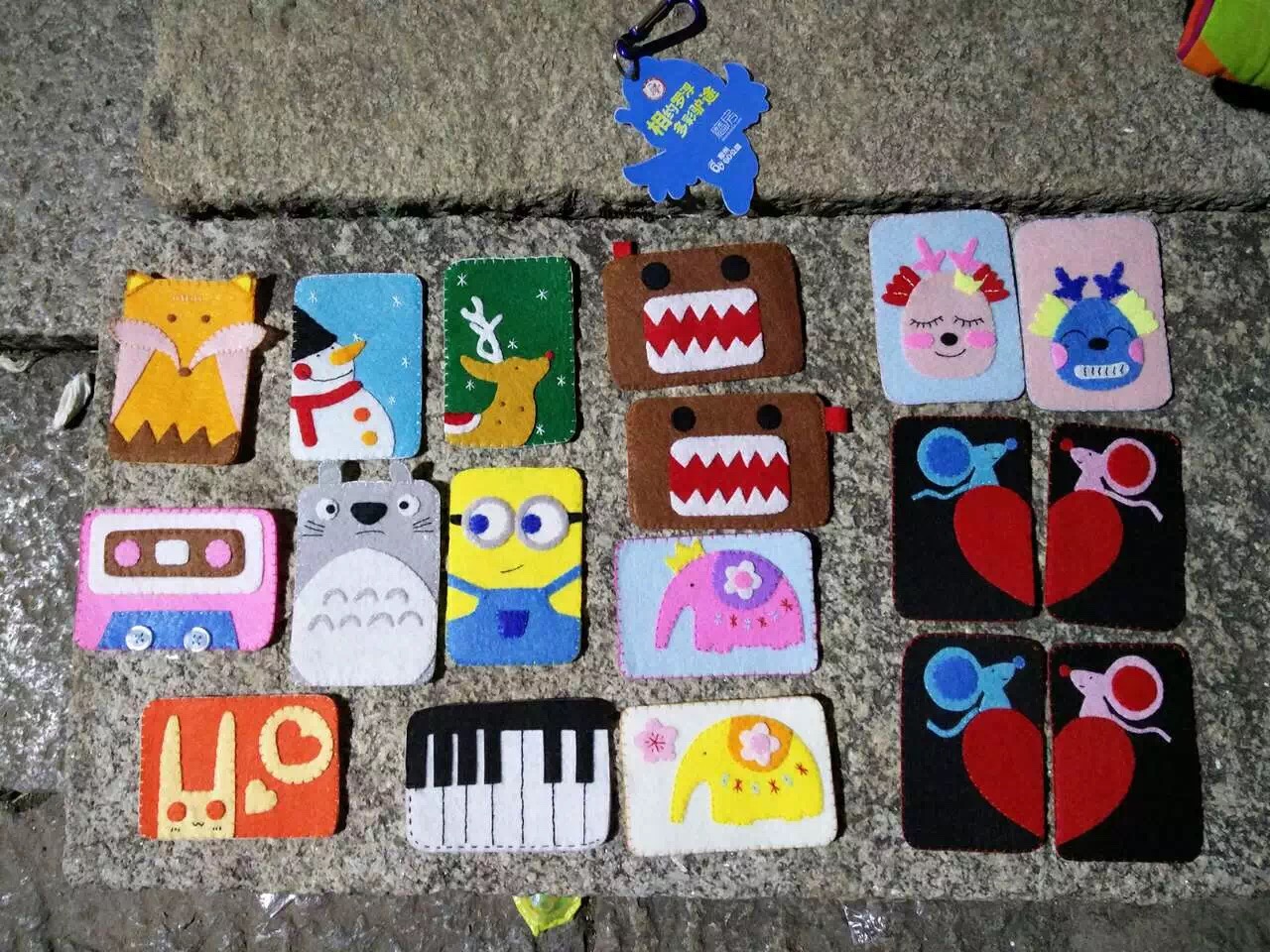 那天我和锦晖走到终点签到处,扭扭捏捏了十分钟,我俩都脸皮薄,你推我我推你,谁也不好意思去兜售或叫卖。眼看着人群逐渐散去,我急了,决定豁出去!跑到去停车场必经的路口,摆开作品,举起写着“义卖”2个大字的牌子,喊起来。开始有人注意到我们了!虽然大部分只是张望一下交头接耳地绕开了,但还是有几个人前来了解的,卡套的可爱造型吸引了2位美女,买下了2个。终于开张了!?