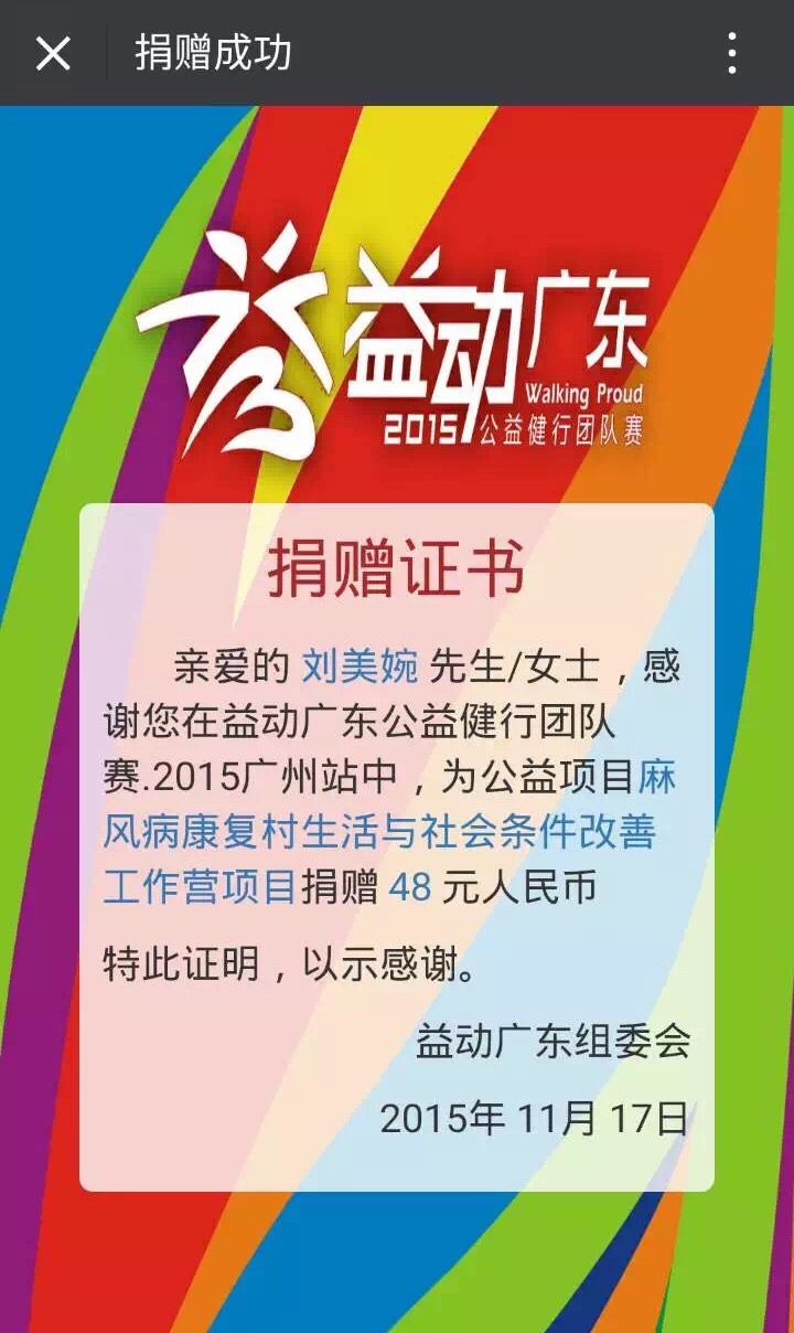 同样值得一提的是我的小姑。她心非常善,容易感动,常常读着书就哭成泪人儿。得知我参加了益动广东之后,不遗余力地支持:自己捐了很多次,捐了第一笔大数后,只要微信钱包里有点零钱(多是在群里抢红包累积的),就凑成一个吉利的数字如19.99、16.66、18.8进行捐赠。此外,几乎每天都在朋友圈发动她的朋友同事学生们一起行善。“陌生人”那部分善款,几乎有一半是来自小姑的朋友。她发朋友圈非常有技巧,每条都不重样,也不会直接强硬地要求大家支持,而是分享自己的捐赠证书,和因行善而得的好心情,自然地就有许多好人的善心被唤醒,一起来做善事。据我所知,她的朋友中也有数位是累计捐赠超过3次的。