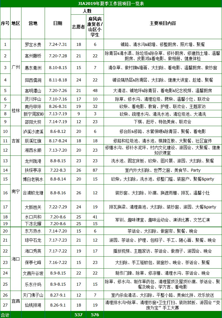 2019 年7-8月,JIA七个城市的537位志愿者去到25个康复村和2个学校开展工作营,支持约520名康复者和80名乡村小学的学生。